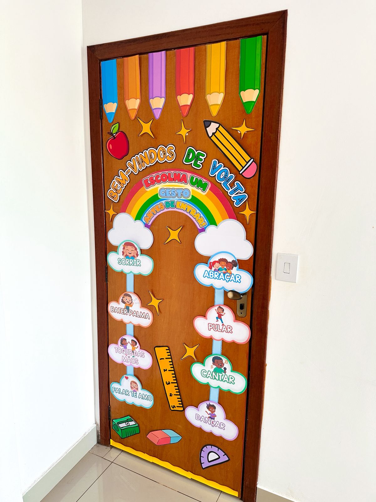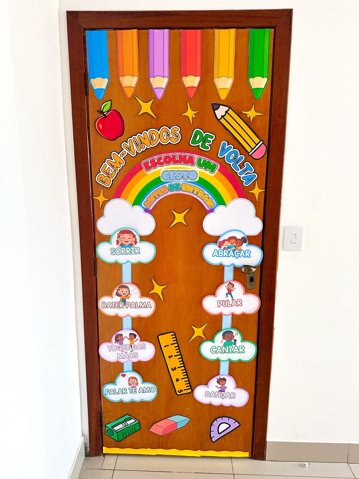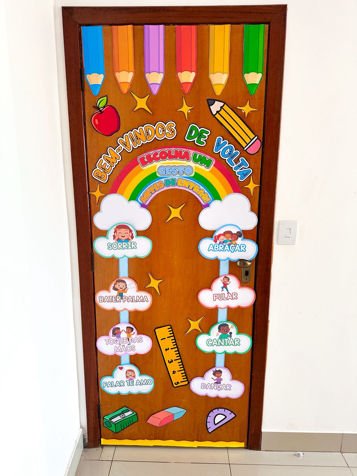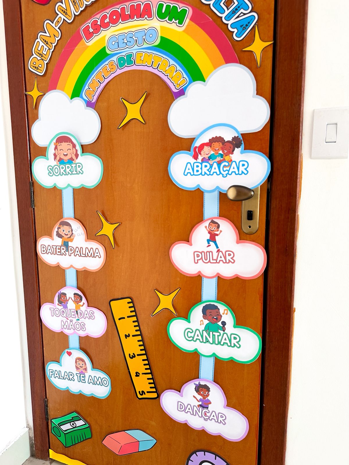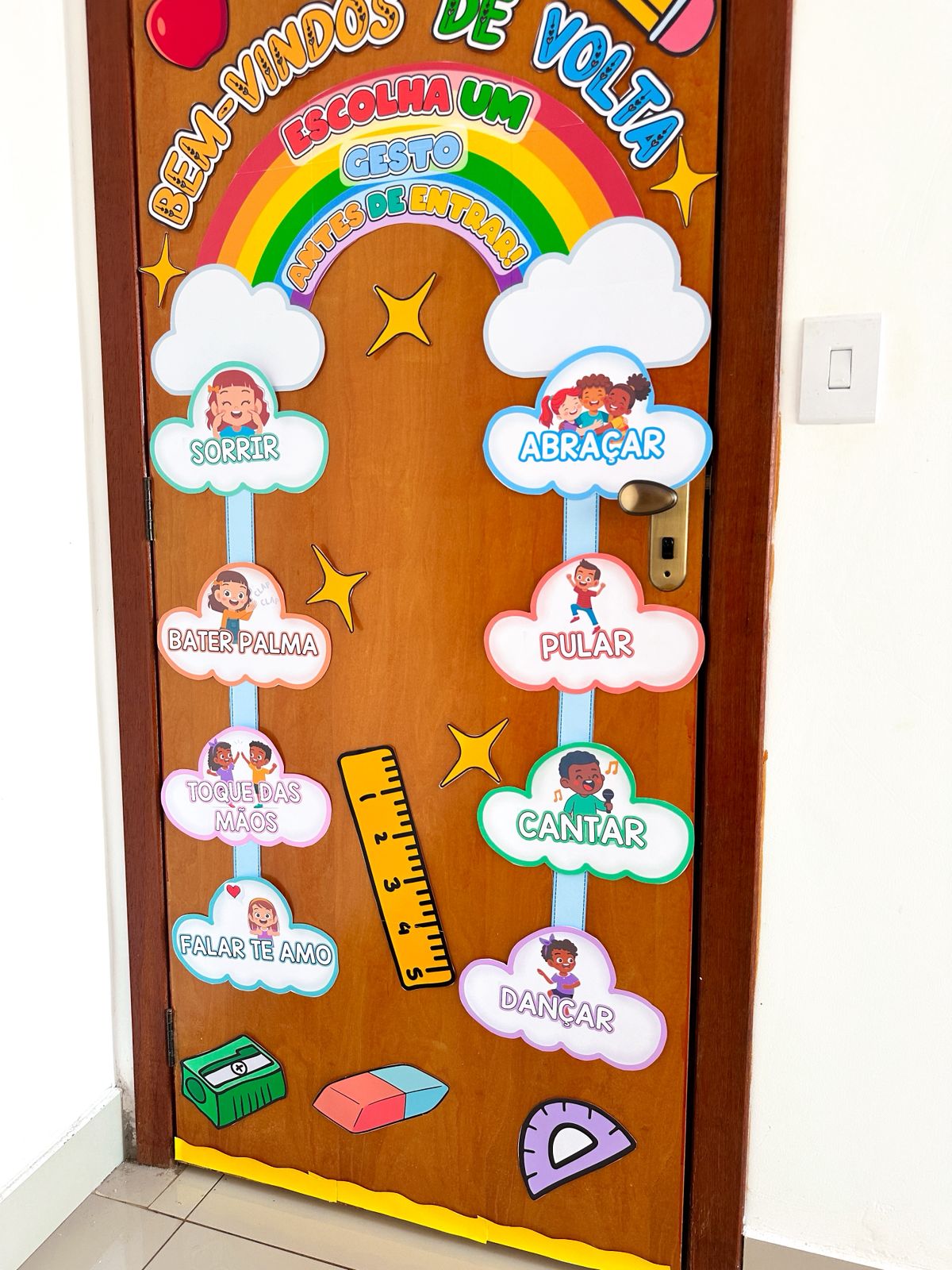 Olá profs, hoje estamos trazendo esse painel para a porta com tema bem-vindos de volta dinâmico, onde as crianças brincam de escolher um gesto antes de entrar na sala. O painel contem 32 páginas, a porta utilizada mede entorno de 1,95m de altura e 80 cm de largura.
